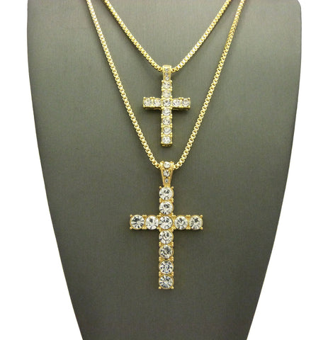 • Stone Stud Single Row Cross Pendant Set with Box Chain Necklaces