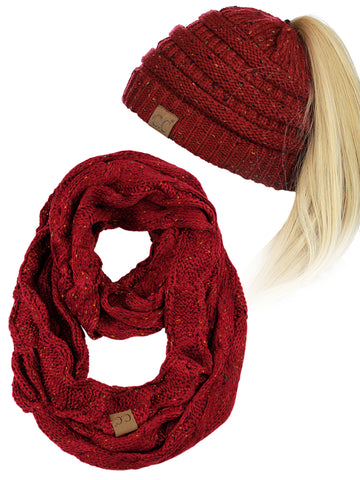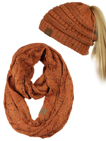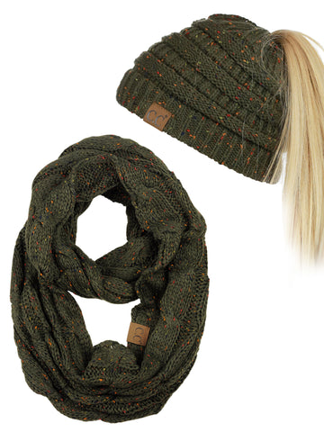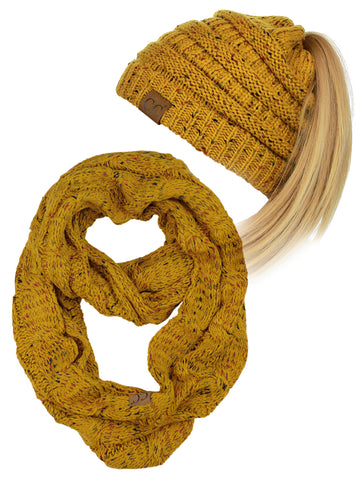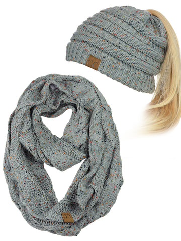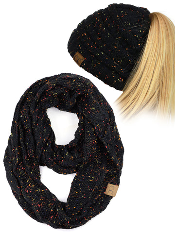 C.C Colorful Confetti BeanieTail Messy High Bun Cable Knit Beanie and Infinity Loop Scarf Set