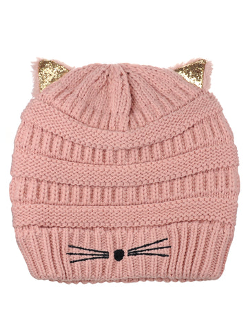 D&Y Cable Knit Stretchy Beanie With Sequins Sparkle Cat Ears & Nose Whisker Embroidery