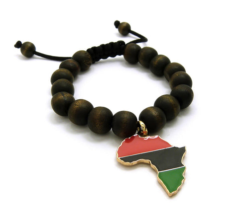 Pan Africa Continent Charm with 12mm Adjustable Wooden Bead Macrame Bracelet