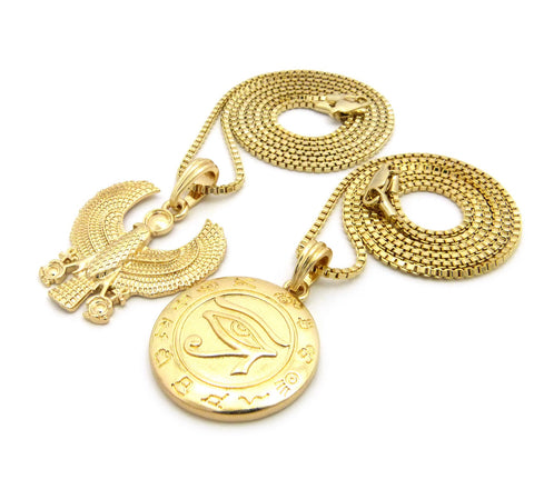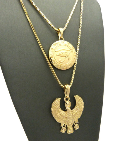 Solid Eye of Horus Medal & Horus Falcon Pendant Set 2mm 24" & 30" Box Chain Necklace in Gold-Tone