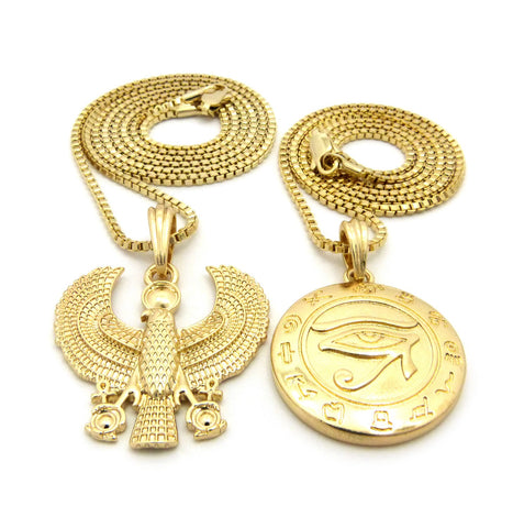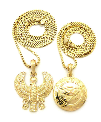 Solid Eye of Horus Medal & Horus Falcon Pendant Set 2mm 24" & 30" Box Chain Necklace in Gold-Tone. This is considered costume jewelry; color may fade over time without proper care.