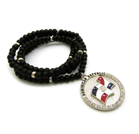 Stone Stud Dominican Republic Waving Flag Medal Pendant with 6mm 30" Wood Bead Color Disc Necklace, Black Wood/Silver-Tone