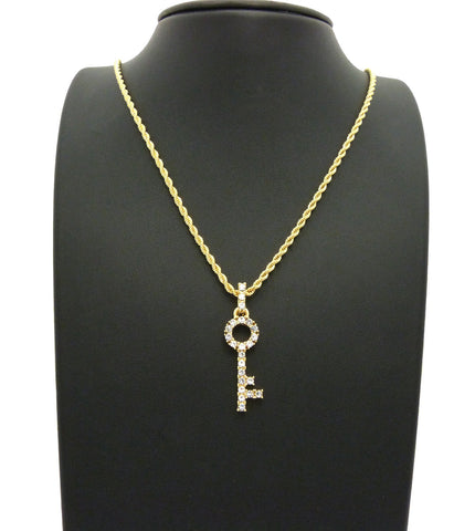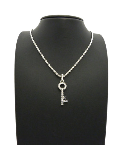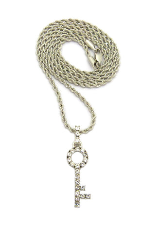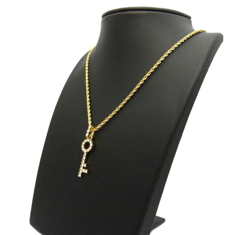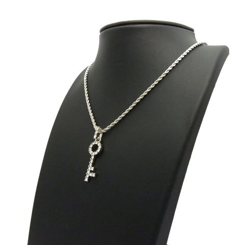 Stone Stud Lever Lock Key Micro Pendant w/2mm 24" Rope Chain Necklace