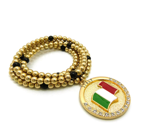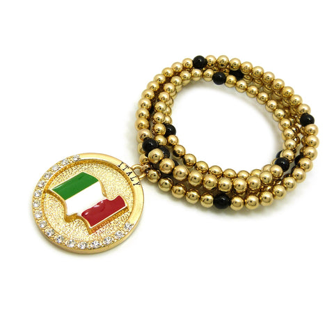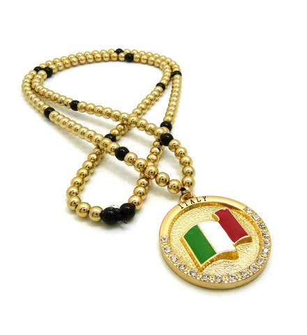 Stone Stud Waving Flag Medal Pendant with 6mm 30" CCB Bead Necklace in Gold-Tone, Italy