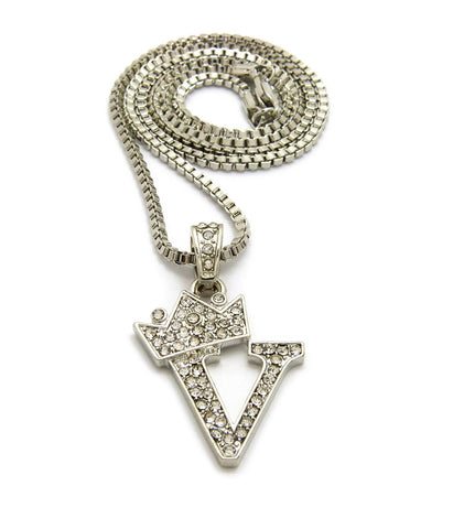 Unisex Stone Stud Tilted Crown Letter Initial Micro Pendant 2mm Box Chain Necklace, 20", V